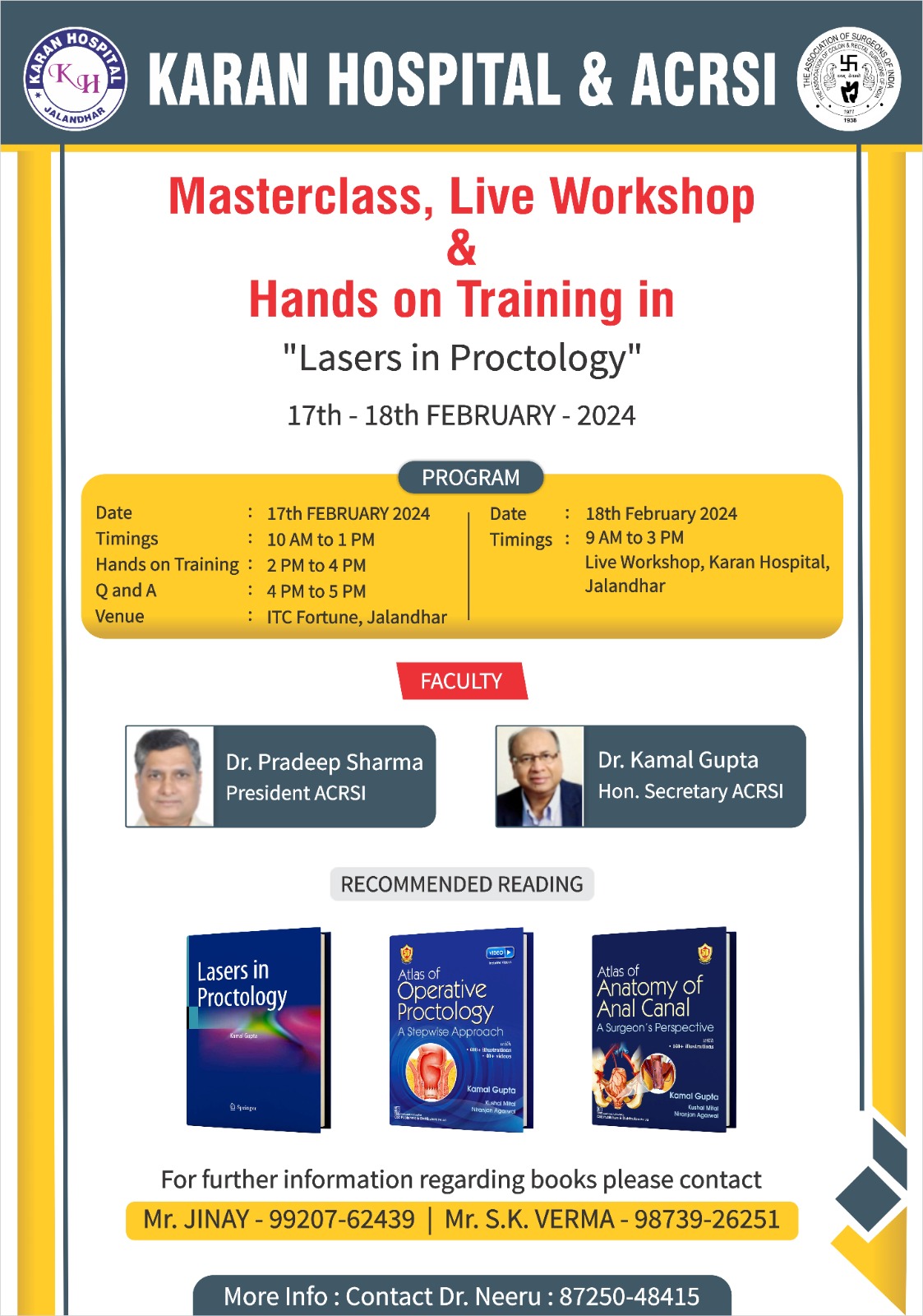 At Karan Hospital, we offer specialized proctology training programs under the Skill Enhancement Program of the Association of Surgeons of India (SEPA), which equips surgeons with advanced laser techniques for anorectal surgery. This course offers indepth training on utilizing minimally invasive techniques and lasers for treating prevalent anorectal conditions. Participants will engage in practical sessions covering laser hemorrhoidoplasty (LHP), fistula treatment (including demonstrations of ProctoCorTM and VAAFT scopes), laser lateral internal sphincterotomy, and video-assisted pilonidal sinus ablation (VALAPS).